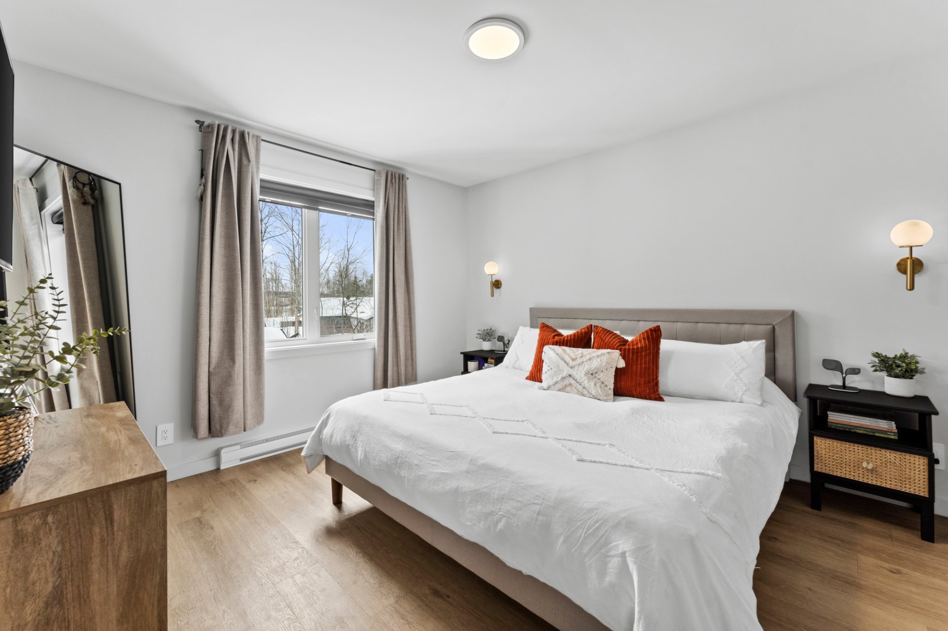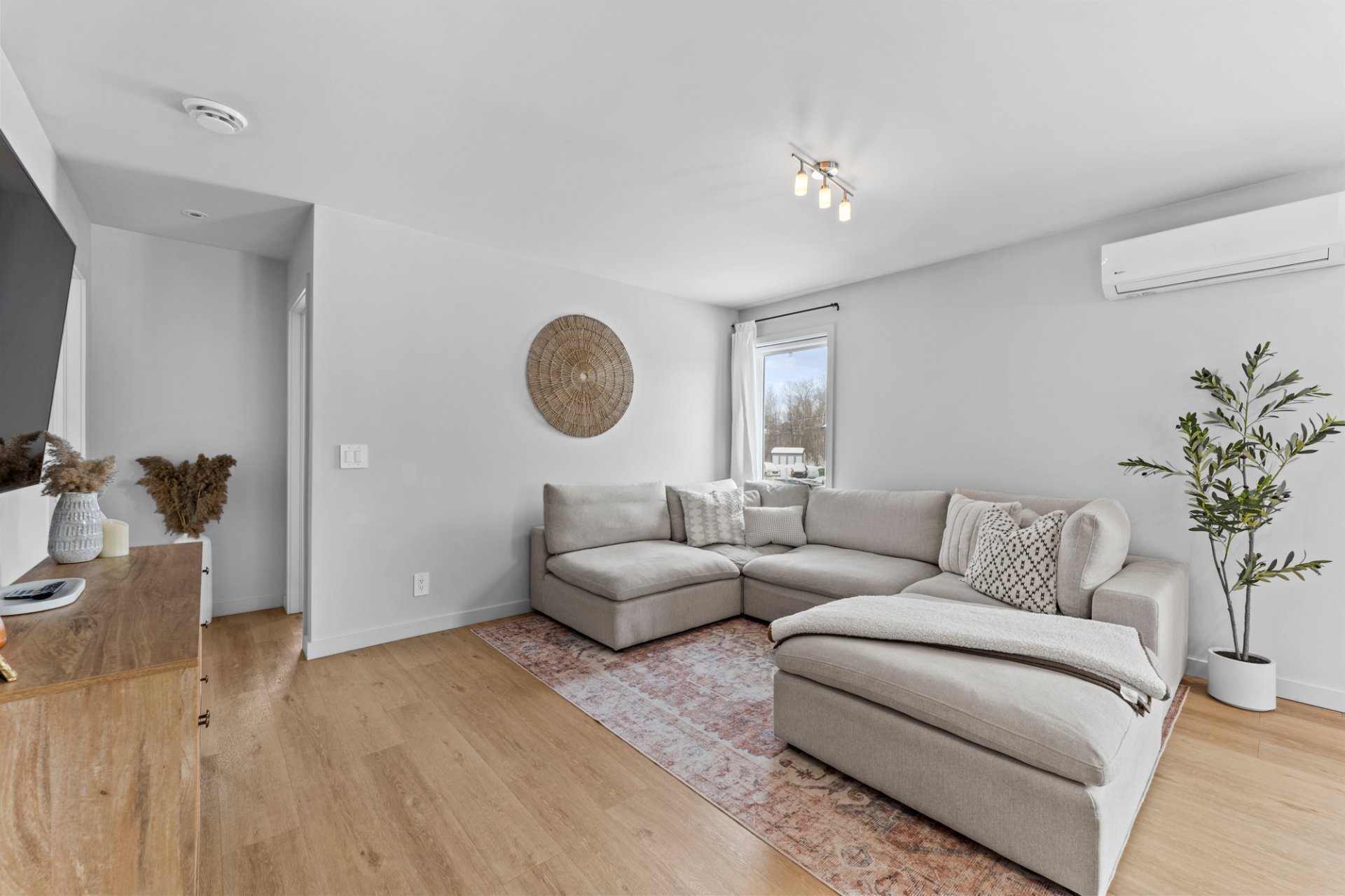 kitchen, and a generous living room, where large windows
