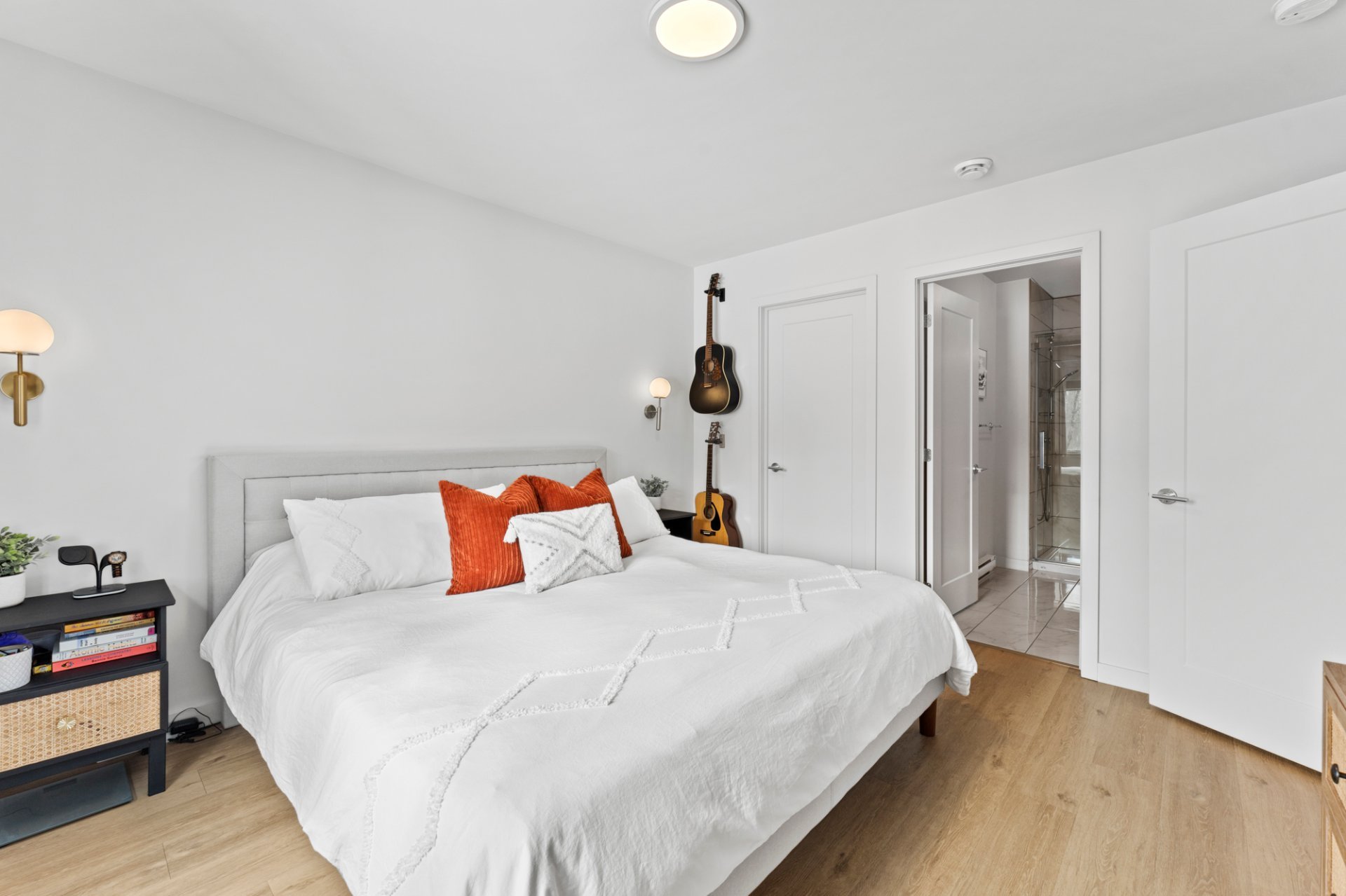 Upon entering, a built-in wardrobe leads to a bright,